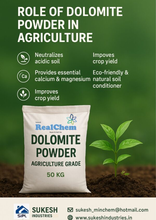 Dolomite powder is used in agriculture to condition soil by neutralizing acidity